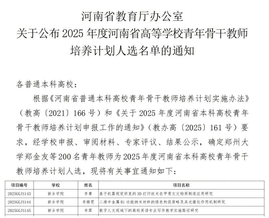 8月22日,河南省教育厅办公室发布《关于公布2025年度河南省高等学校青年骨干教师培养计划人选名单的通知》(教办高〔2025〕217号),正式公布2025年度青年骨干教师培养计划人选名单,经教师申报,学院推荐,学校审核,专家评审及公示程序 久久高清视频,我校推荐的李尊,李雅雯,李霖三位青年教师全部入选2025年度河南省高等学校青年骨干教师培养计划人选。